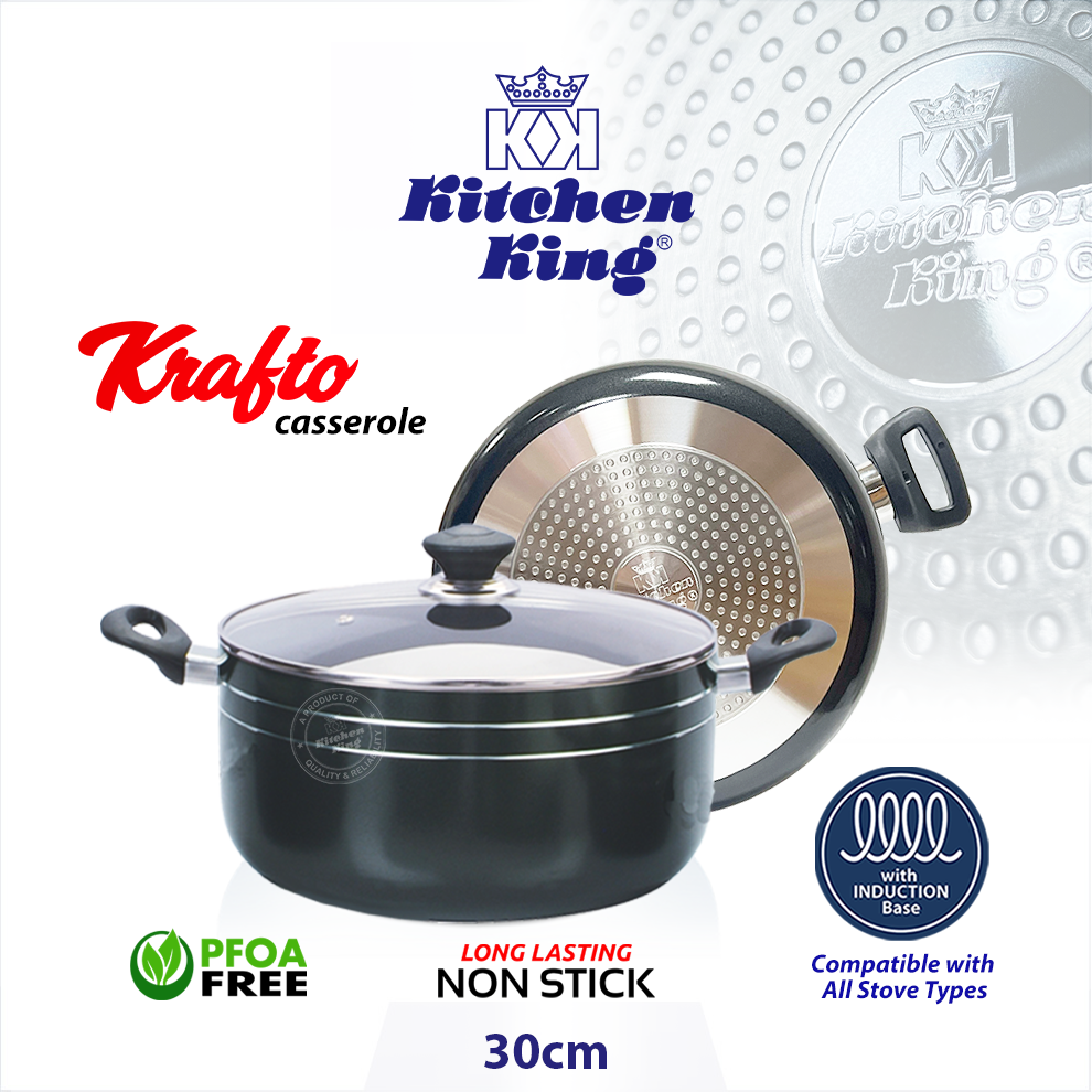 Kitchen King Cookware provides variety of best non-stick induction casseroles in range of sizes and designs which ensure chefs enjoy the time while they cook beef, chicken, fish or delicious rice in whatever quantity they want. It works smoothly on induction/electric stoves due to its conductive stainless-steel base. A perfect stylish body is manufactured from heavy gauge high quality pure aluminium which ensures even heat distribution for better cooking and results in fantastic performance throughout in kitchen. The use of premium 2x layer of non-stick coating (PFOA free) prepares healthier meals without the release of any harmful toxins or fumes and certifies the release of food easily. The heat-resistant and ergonomic handles with a smooth finish gives it a strong grip and luxurious exterior look. It comes with an adaptive tempered glass lid with a steam vent, allowing you to monitor on the progress of your meal without losing moisture. Our cookware is suitable for gas and electric glass stovetops. Dishwasher safe but hand-washing is recommended to preserve the appearance of cookware.
