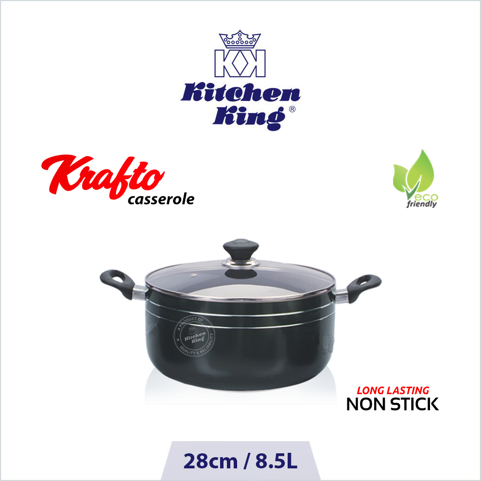 Kitchen King Cookware provides variety of best non-stick casseroles in range of sizes and designs which ensure chefs enjoy the time while they cook beef, chicken, fish or delicious rice in whatever quantity they want. A perfect stylish body is manufactured from heavy gauge high quality pure aluminium which ensures even heat distribution for better cooking and results in fantastic performance throughout in kitchen. The use of premium 2x layer of non-stick coating (PFOA free) prepares healthier meals without the release of any harmful toxins or fumes and certifies the release of food easily. The heat-resistant and ergonomic handles with a smooth finish gives it a strong grip and luxurious exterior look. It comes with an adaptive tempered glass lid with a steam vent, allowing you to monitor on the progress of your meal without losing moisture. Our cookware is suitable for gas and electric glass stovetops. Dishwasher safe but hand-washing is recommended to preserve the appearance of cookware.