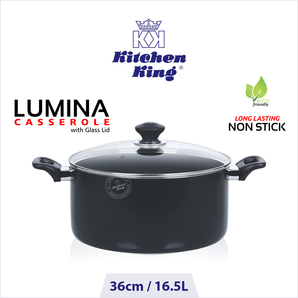 Kitchen King Cookware provides variety of best non-stick casseroles in range of sizes and designs which ensure chefs enjoy the time while they cook beef, chicken, fish or delicious rice in whatever quantity they want. A perfect stylish body is manufactured from heavy gauge high quality pure aluminium which ensures even heat distribution for better cooking and results in fantastic performance throughout in kitchen. The use of premium 2x layer of non-stick coating (PFOA free) prepares healthier meals without the release of any harmful toxins or fumes and certifies the release of food easily. The heat-resistant and ergonomic handles with a smooth finish gives it a strong grip and luxurious exterior look. It comes with an adaptive tempered glass lid with a steam vent, allowing you to monitor on the progress of your meal without losing moisture. Our cookware is suitable for gas and electric glass stovetops. Dishwasher safe but hand-washing is recommended to preserve the appearance of cookware.