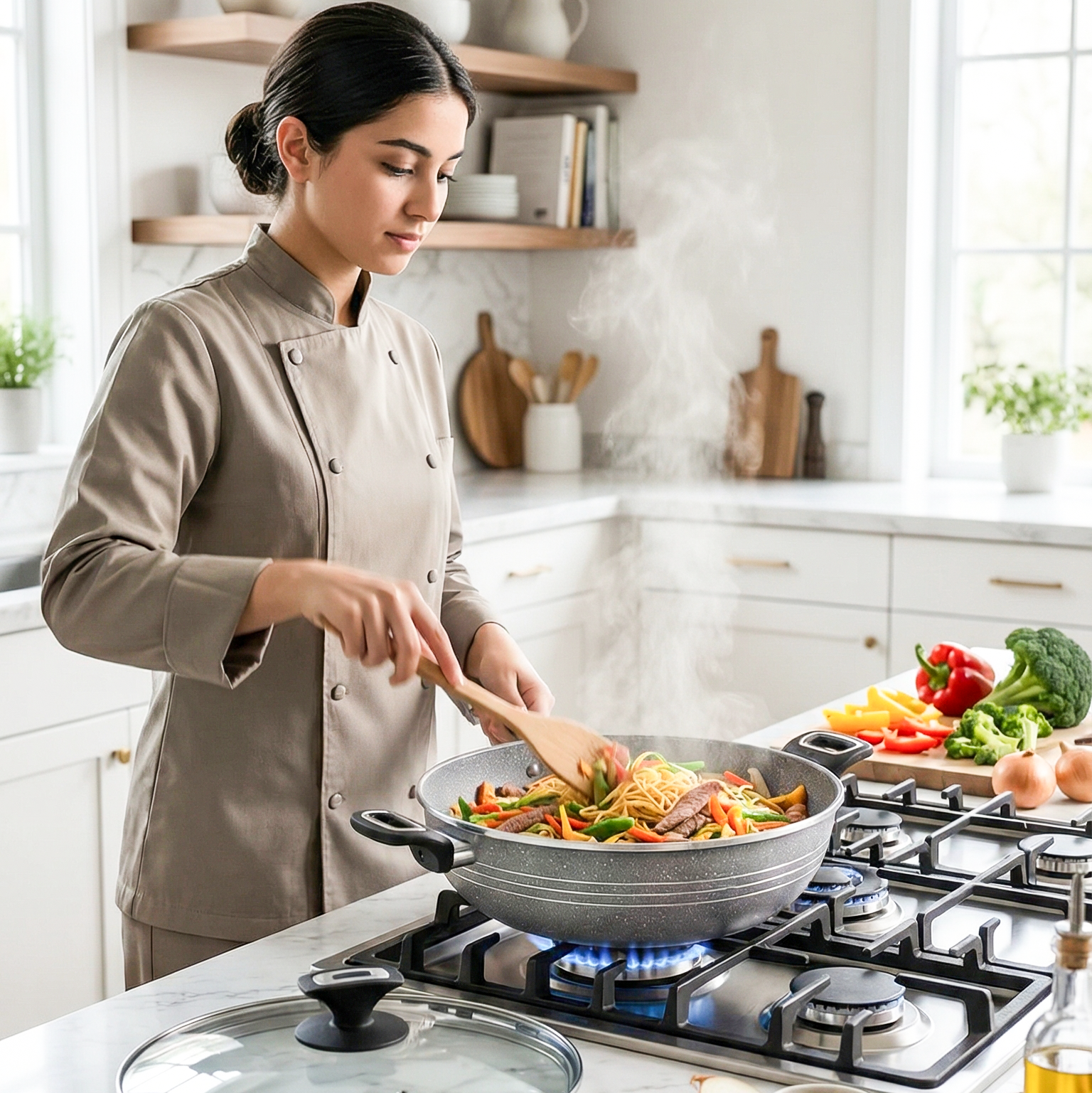 Our marble coated wok is perfect for delicious meat stir-fries to amazing chicken noodle soups or seared king prawns. Enjoy all kind of dishes as steep sloping edges not only assist to keep all those wonderful flavors but they also help to prevent spills when using sauces in high heat. The interior is premium non-stick marble coating (PFOA free), which makes it durable and long lasting on which you can prepare healthier meals without the release of any harmful toxins or fumes. The heat-resistant and ergonomic handles with a smooth finish are riveted to give strong grip and luxurious exterior look. It comes with an adaptive tempered glass lid with a steam vent, allowing you to monitor on the progress of your meal without losing moisture. Our cookware is suitable for gas and electric glass stovetops. Dishwasher safe but hand-washing is recommended to preserve the appearance of cookware.